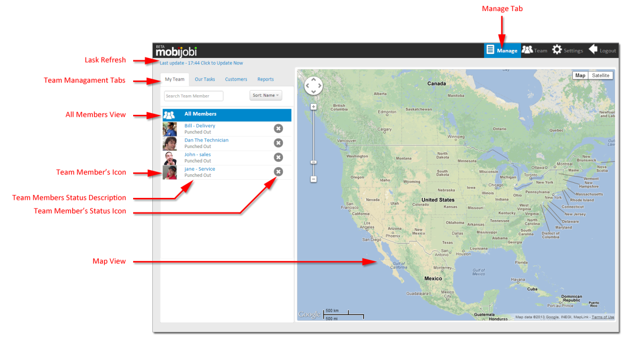 - Management tabs including: “My Team“, “Our Tasks”, “Customers“, “Reports” tabs.